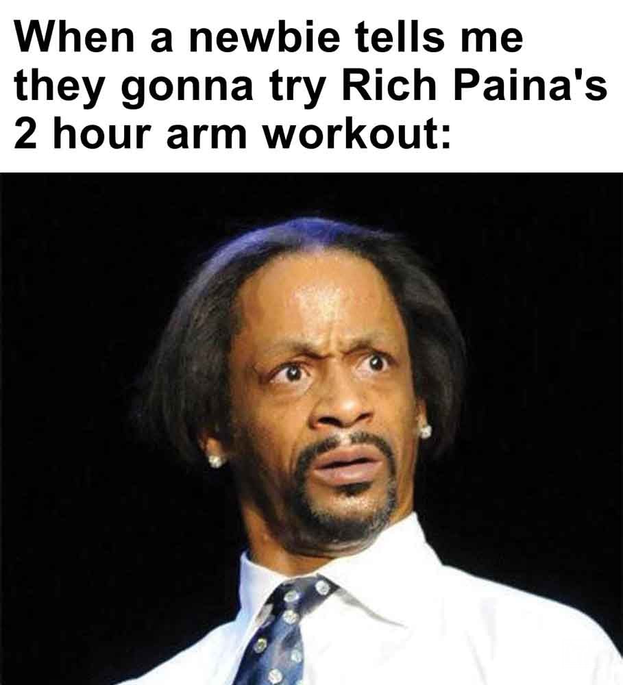 Image, MemesWhen a newbie tells me they gonna try rich paina’s 2 hour arm workout Gets to 24 hour gym it’s closed When you’re dieting and you see someone having seconds