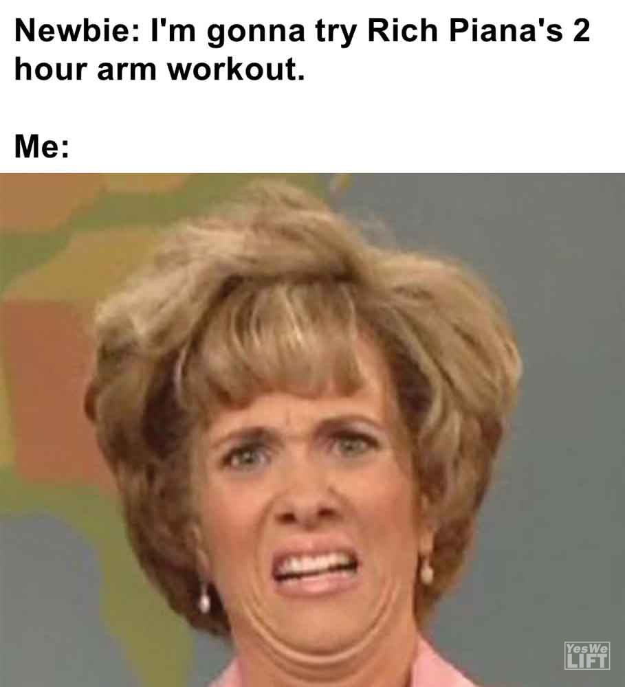 Image, MemesNewbie i’m gonna try rich piana’s 2 hour arm workout. me Non lifter you workout too much. me When there’s no one in the gym strong enough to spot you