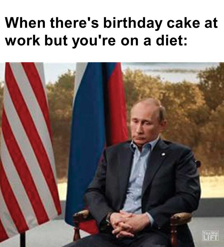 Image, MemesWhen there’s birthday cake at work but you’re on a diet When you’re back from the water fountain and someone’s taken your bench When someone tells you they don’t have time to workout