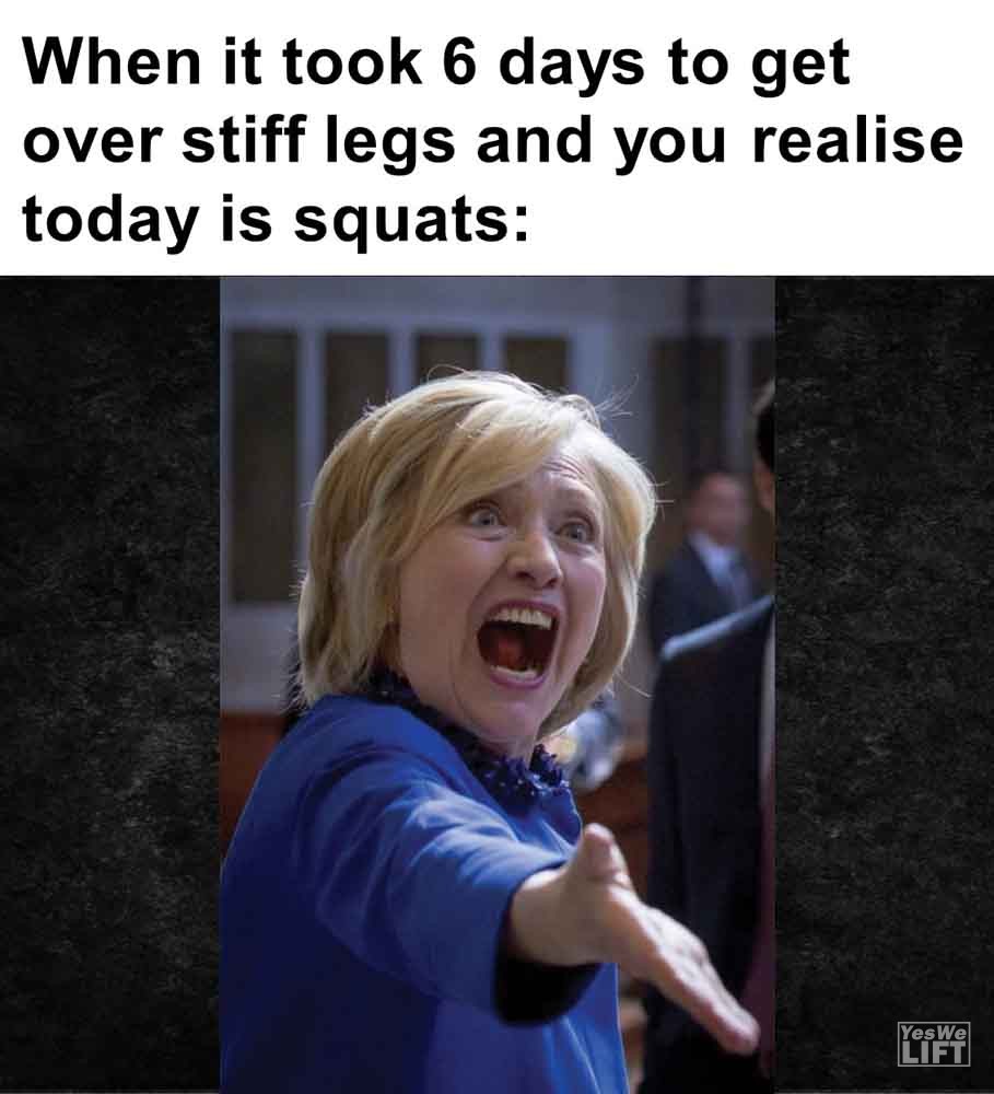 Image, MemesWhen it took 6 days to get over stiff legs and you realise today is squats When you see someone in the gym putting their plates back When someone tells you they don’t have time to workout
