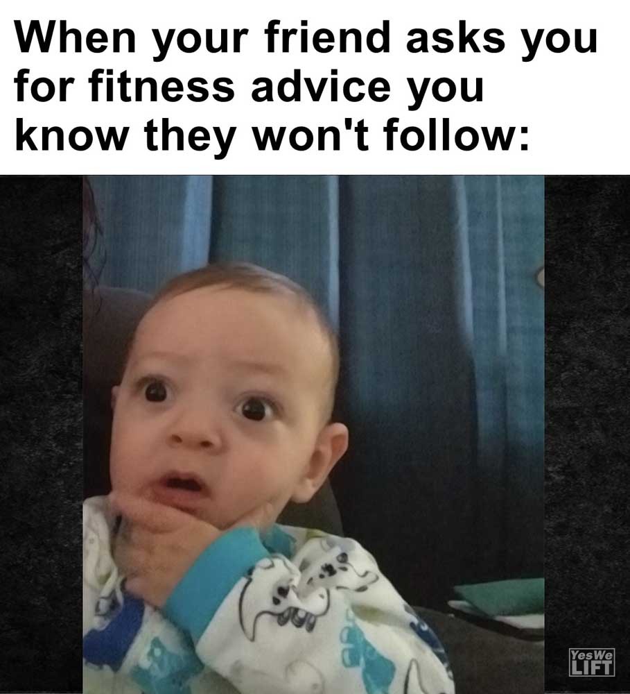 Image, MemesWhen your friend asks you for fitness advice you know they won’t follow When it’s chest day but you remember it’s actually legs day When the tub says 2 scoops but you took 3