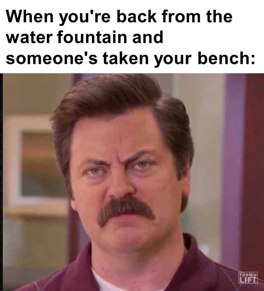 Image, MemesWhen you’re back from the water fountain and someone’s taken your bench That look you give someone when they tell you they gonna start doing crossfit When you see your ex with a new partner who doesn’t even lift