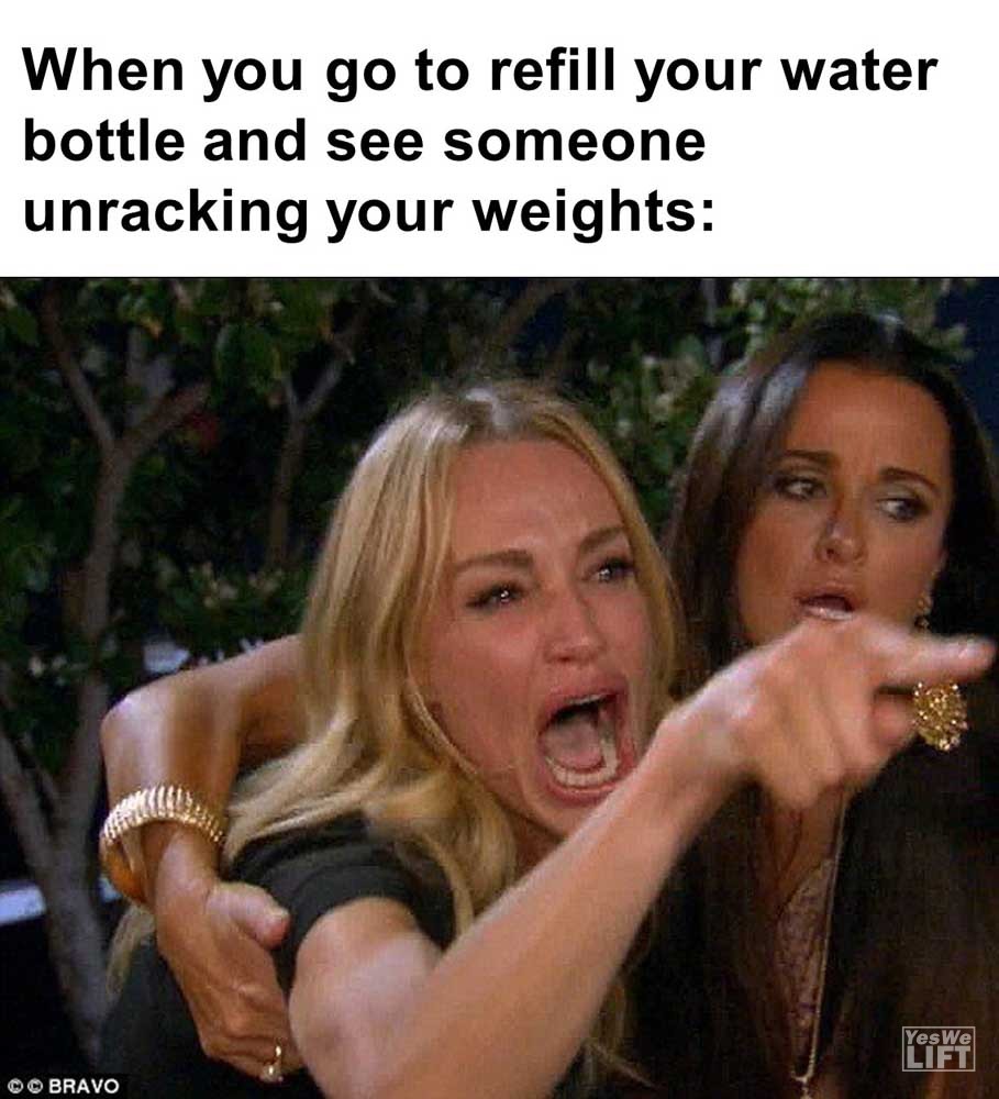 Image, MemesWhen you go to refill your water bottle and see someone unracking your weights When you’re back from the water fountain and someone’s taken your bench When your friend asks you for fitness advice you know they won’t follow