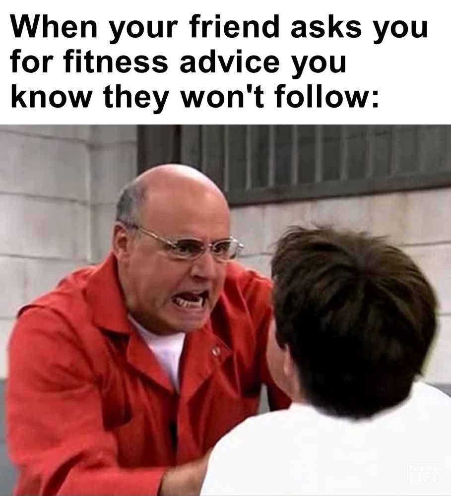 Image, MemesWhen your friend asks you for fitness advice you know they won’t follow When the holidays are over and you gotta go back to chicken rice everyday When you’re resting between sets and someone asks if you’re finished with the bench