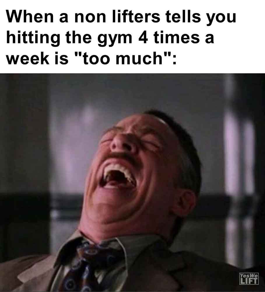 Image, MemesWhen a non lifters tells you hitting the gym 4 times a week is too much Me staring at the 4 year old construction worker in jeans benching 5 lbs When you’re at the gym on friday night and all the equipment is yours