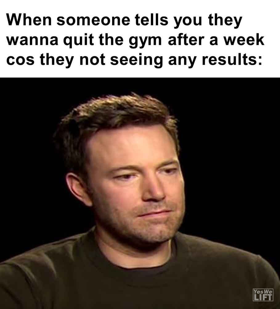 Image, MemesWhen someone tells you they wanna quit the gym after a week cos they not seeing any results When you see someone training with perfect form Gym is my therapy also me when my warmup feels heavy