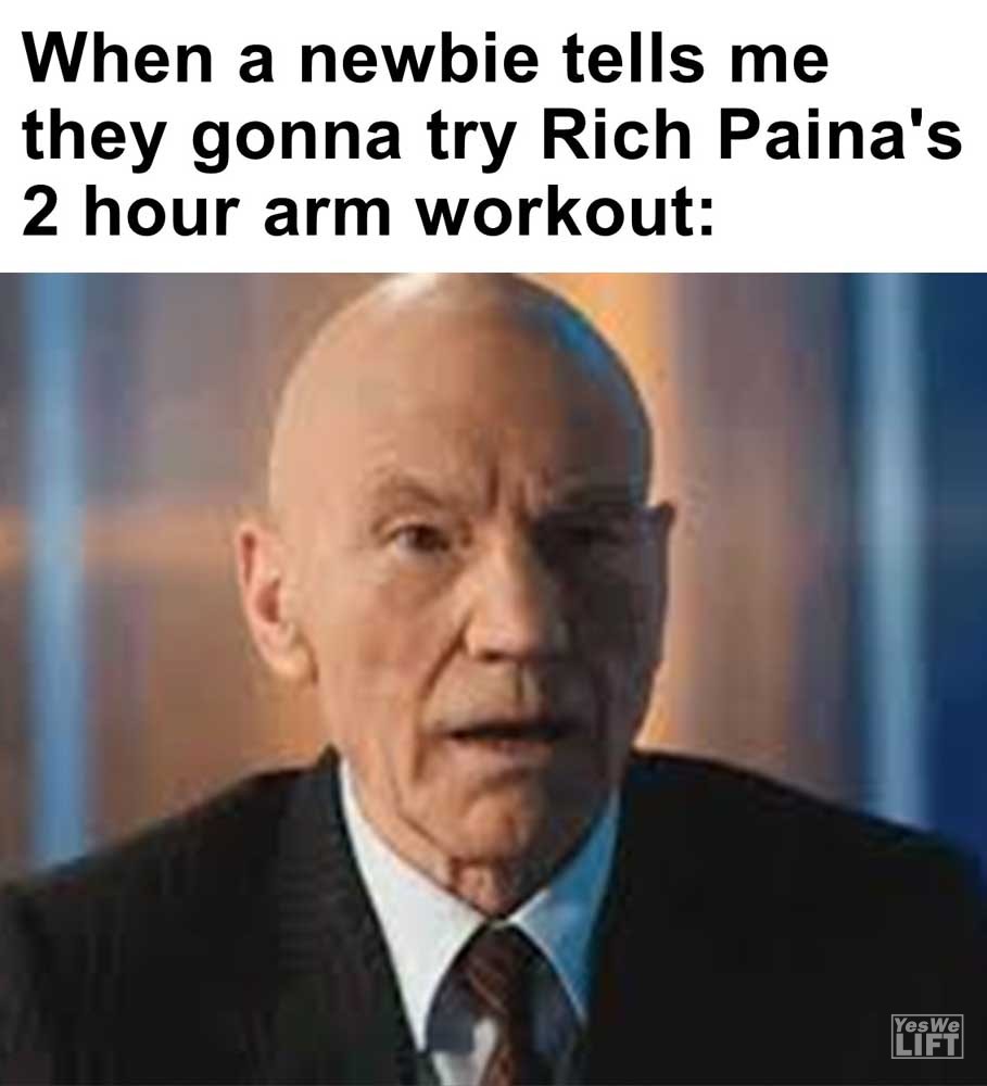 Image, MemesWhen a newbie tells me they gonna try rich paina’s 2 hour arm workout Non lifter you’re getting too big. me When you’re dieting and you see someone having seconds