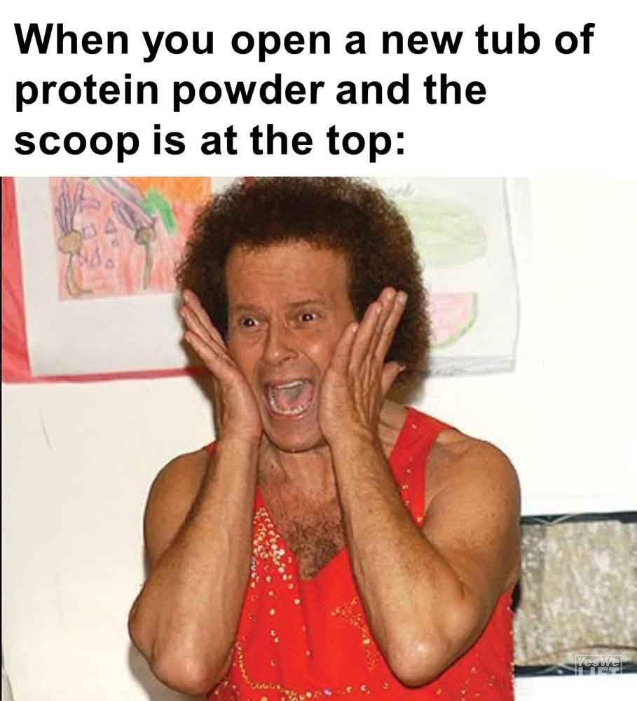Image, MemesWhen you open a new tub of protein powder and the scoop is at the top That feeling when you hit a new pr When someone asks me why i workout so much