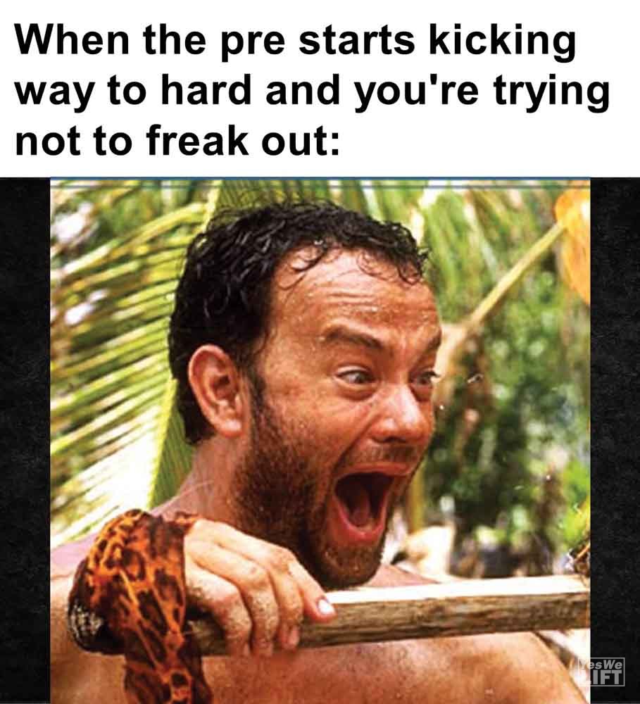 Image, MemesWhen the pre starts kicking way to hard and you’re trying not to freak out When you overplayed every song in your gym playlist and now nothing gets you hype Newbie squatting to parallel is half repping. me