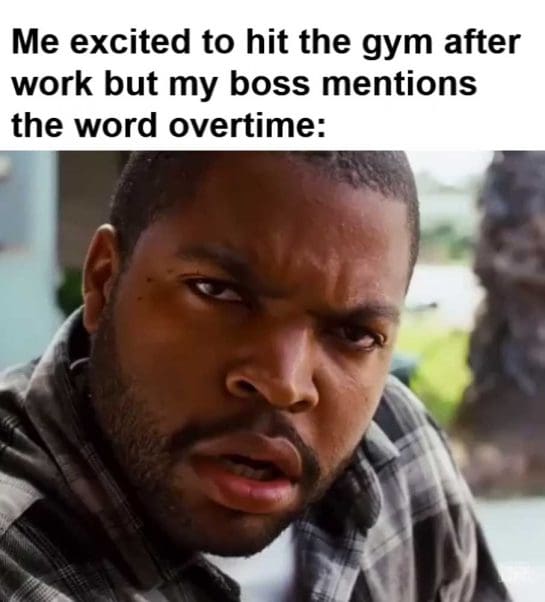 Me excited to hit the gym after work but my boss mentions the word overtime
