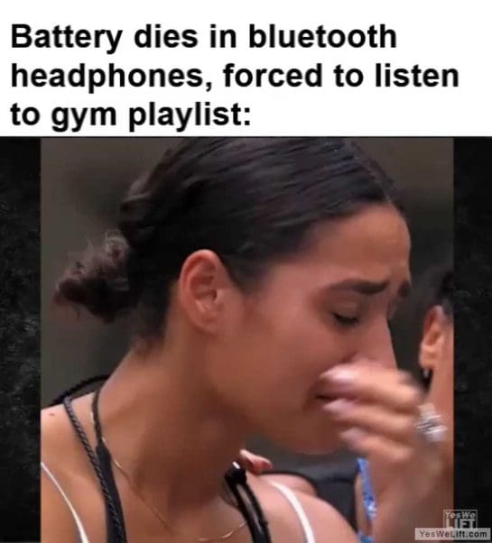 Battery dies in bluetooth headphones, forced to listen to gym playlist