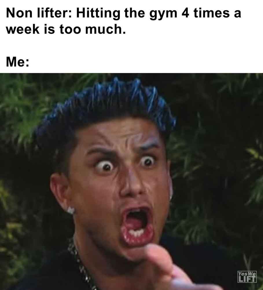 MemesNon lifter hitting the gym 4 times a week is too much. me When the hot girl at the gym starts doing squats right next to you When someone says they don’t train on fridays