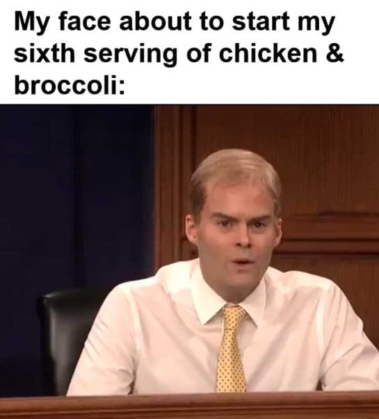My face about to start my sixth serving of chicken broccoli