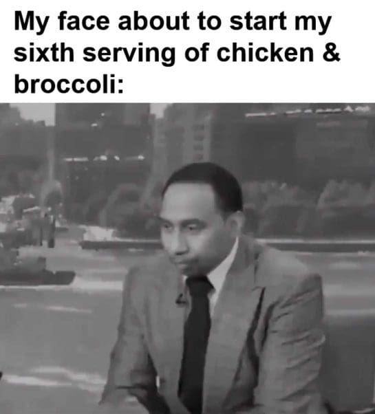 My face about to start my sixth serving of chicken broccoli