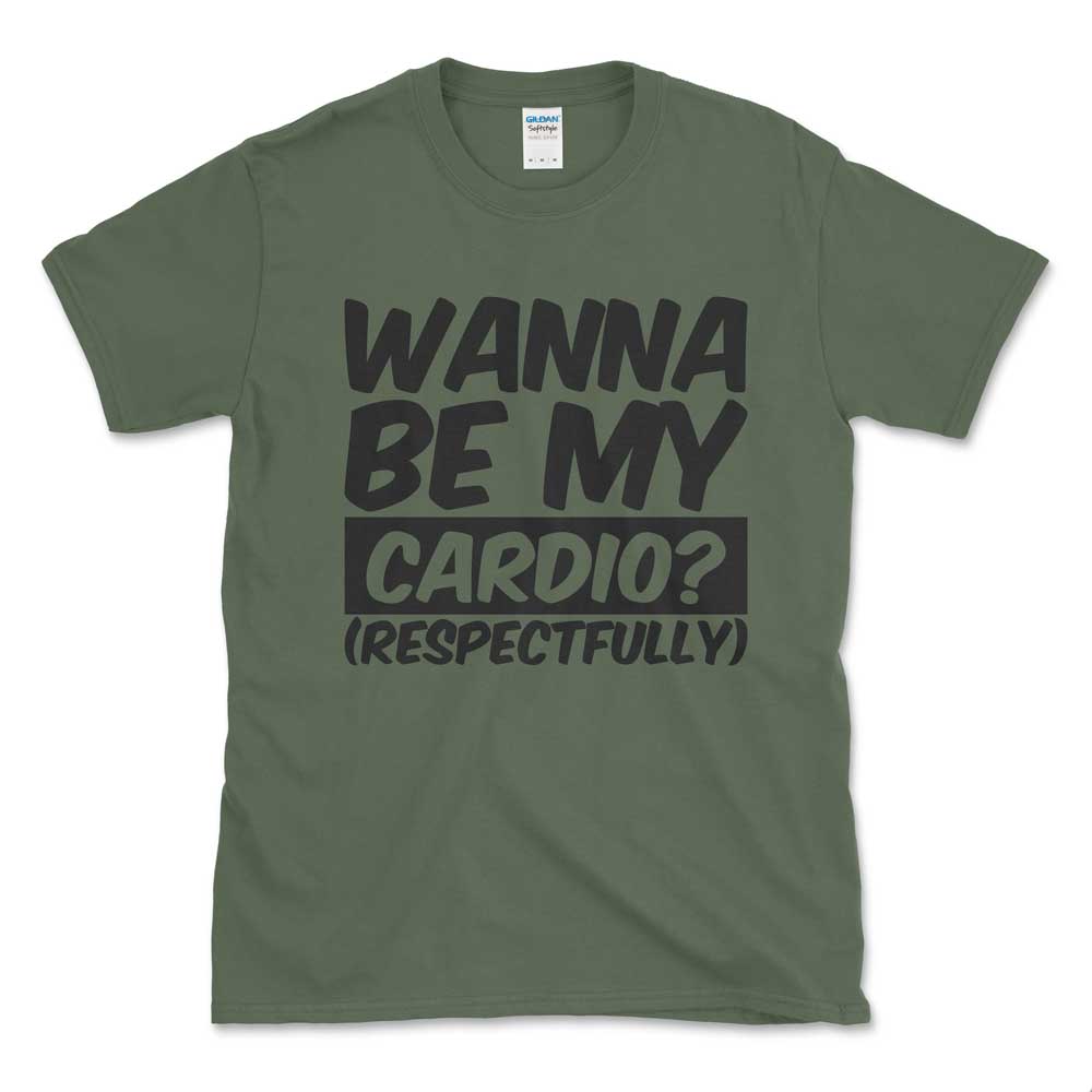 Turn heads with this cheeky shirt, Wanna be my cardio? (respectfully)”