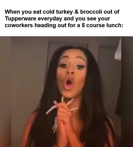 When you eat cold turkey broccoli out of tupperware everyday and you see your coworkers heading out for a